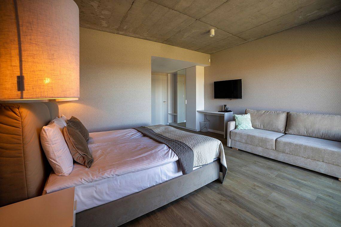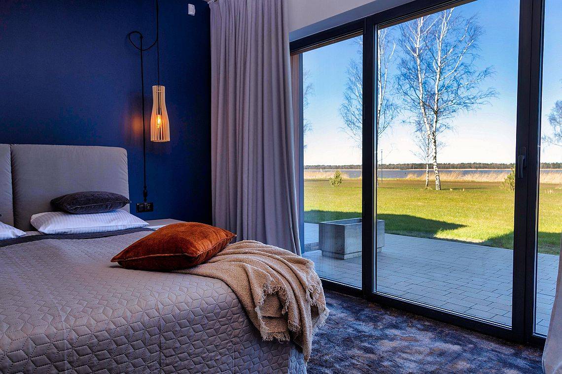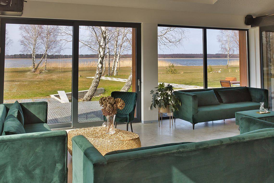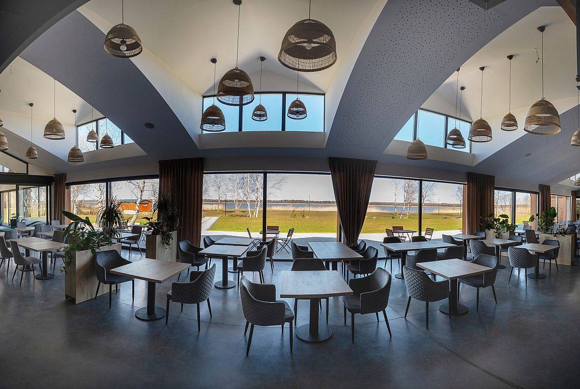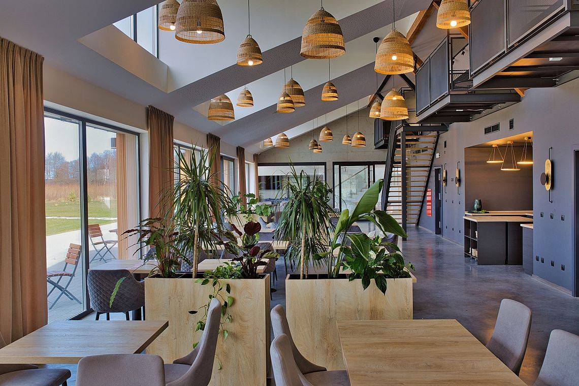 37 pokoi, w standardzie hotelowym, o stonowanym, nowoczesnym i funkcjonalnym wnętrzu. W każdym pokoju komfortowa łazienka, klimatyzacja, telewizor oraz wifi (dla tych wymagających). Dodatkowo 6 apartamentów, samodzielnych z osobnym wejściem, by maksymalnie odciąć się od ludzi, bez przechodzenia przez hol. Połowa pokoi znajduje się na stronie północnej, z pięknym, kojącym widokiem na jezioro. Druga część pokoi to strona południowa, widać stąd dużo zieleni, spokojną ulicę, po której nie porusza się nikt, oprócz Naszych Gości rzecz jasna. Bryła budynku przypominająca stodołę, przepięknie oszklona pozwala czerpać z letniego słońca jak najwięcej promieni. W tym samym budynku, za szklanymi drzwiami znajduje się restauracja o Nazwie Woda i Wiatr – nazwa wzięła się stąd, że przed budową nie było tu nic – tylko wschodni silny wiatr i woda jeziora.