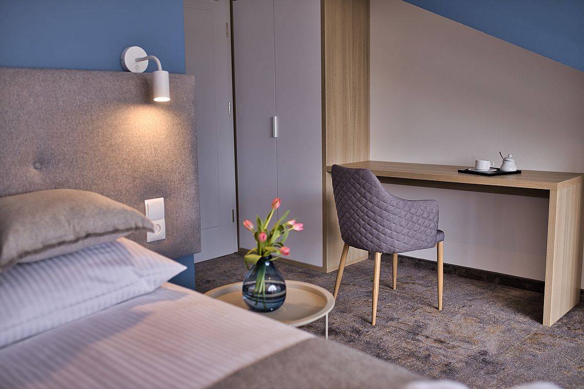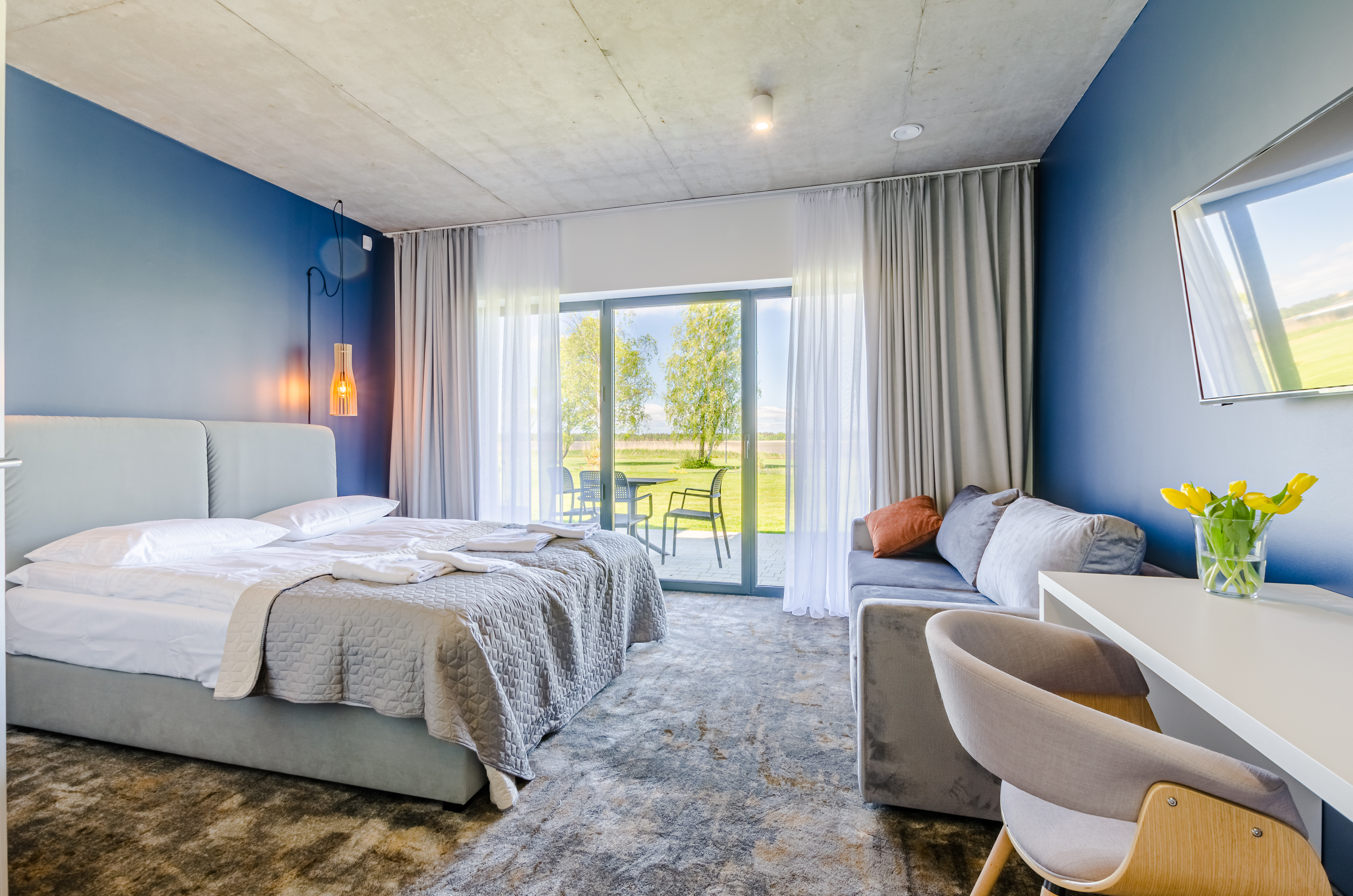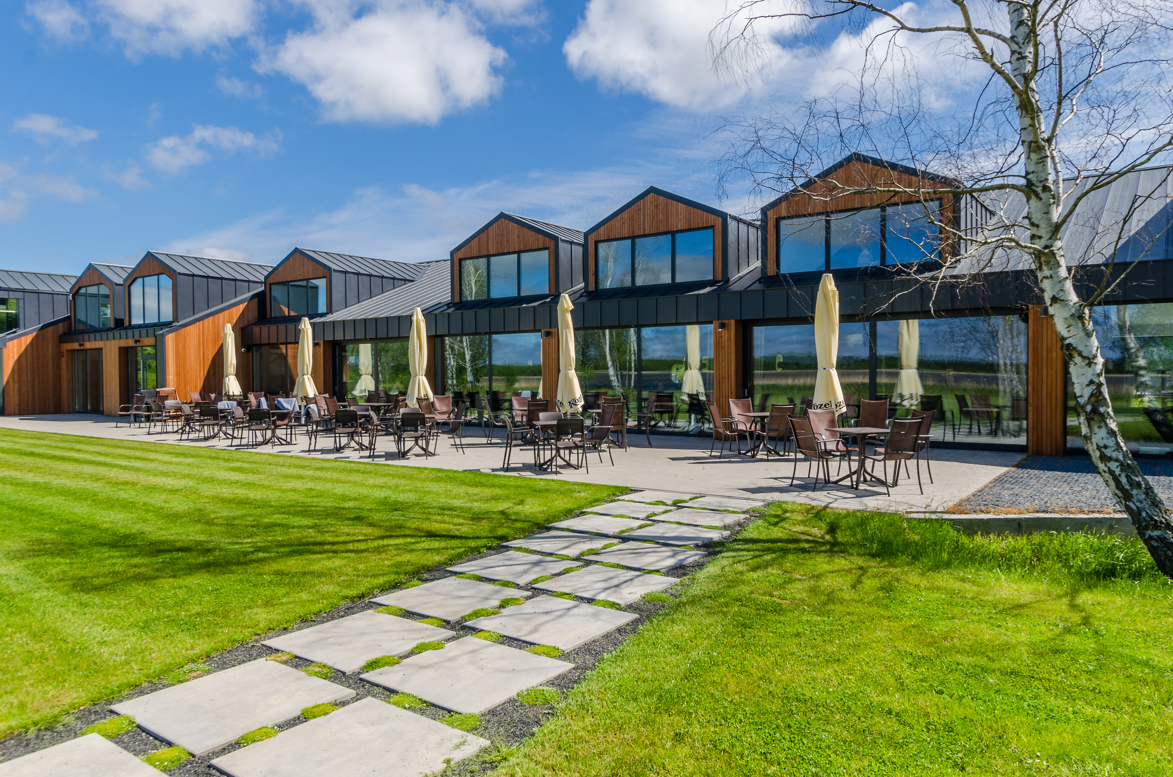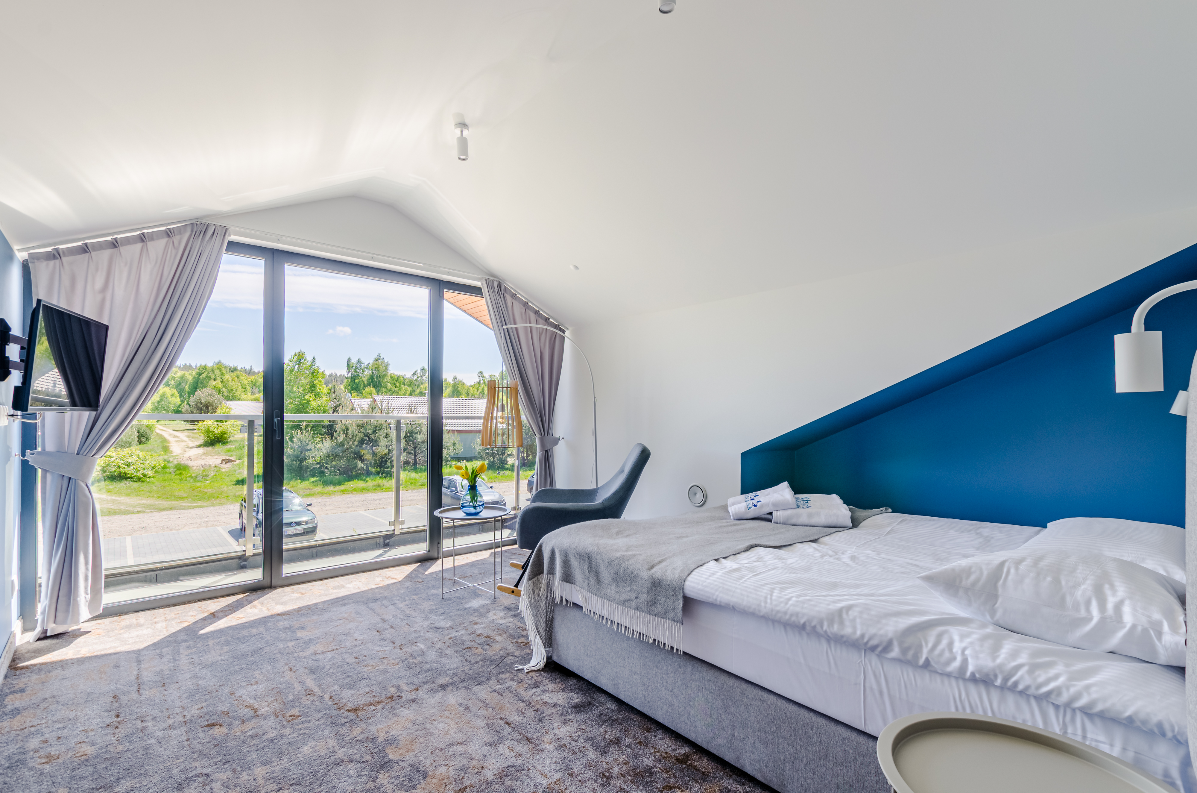 37 pokoi, w standardzie hotelowym, o stonowanym, nowoczesnym i funkcjonalnym wnętrzu. W każdym pokoju komfortowa łazienka, klimatyzacja, telewizor oraz wifi (dla tych wymagających). Dodatkowo 6 apartamentów, samodzielnych z osobnym wejściem, by maksymalnie odciąć się od ludzi, bez przechodzenia przez hol. Połowa pokoi znajduje się na stronie północnej, z pięknym, kojącym widokiem na jezioro. Druga część pokoi to strona południowa, widać stąd dużo zieleni, spokojną ulicę, po której nie porusza się nikt, oprócz Naszych Gości rzecz jasna. Bryła budynku przypominająca stodołę, przepięknie oszklona pozwala czerpać z letniego słońca jak najwięcej promieni. W tym samym budynku, za szklanymi drzwiami znajduje się restauracja o Nazwie Woda i Wiatr – nazwa wzięła się stąd, że przed budową nie było tu nic – tylko wschodni silny wiatr i woda jeziora.
