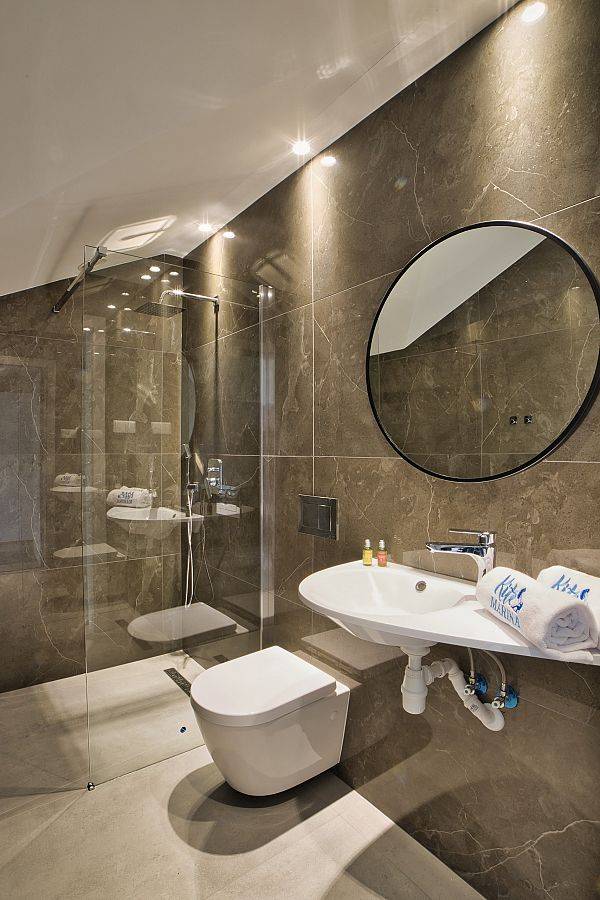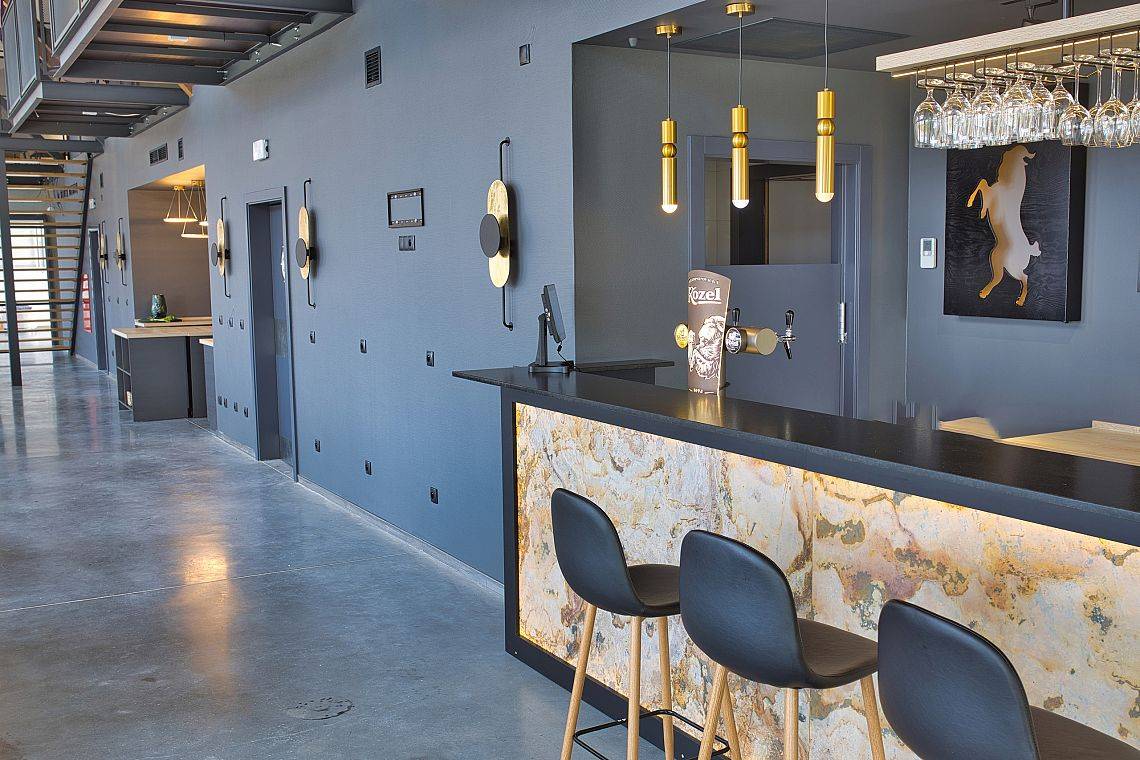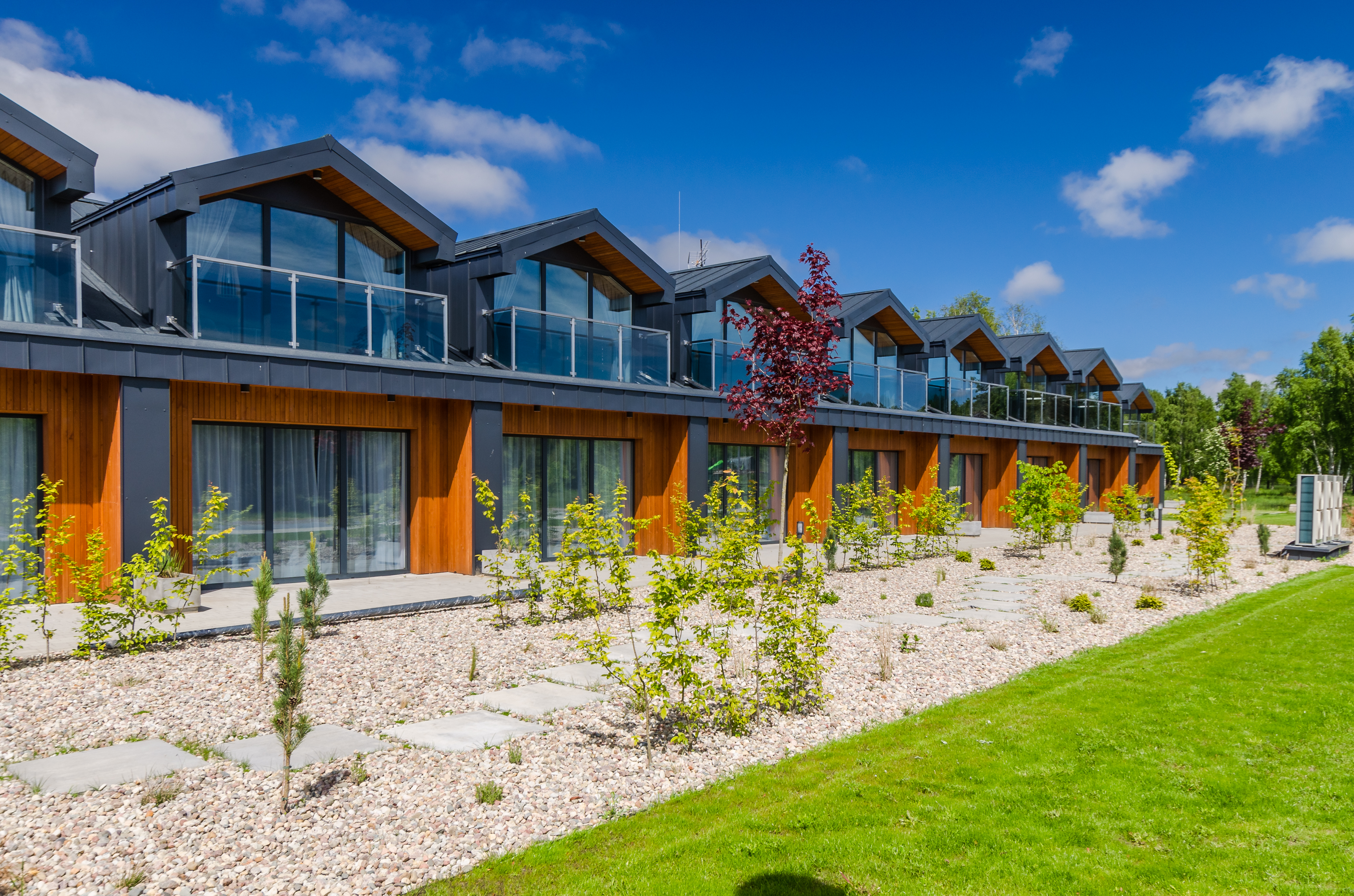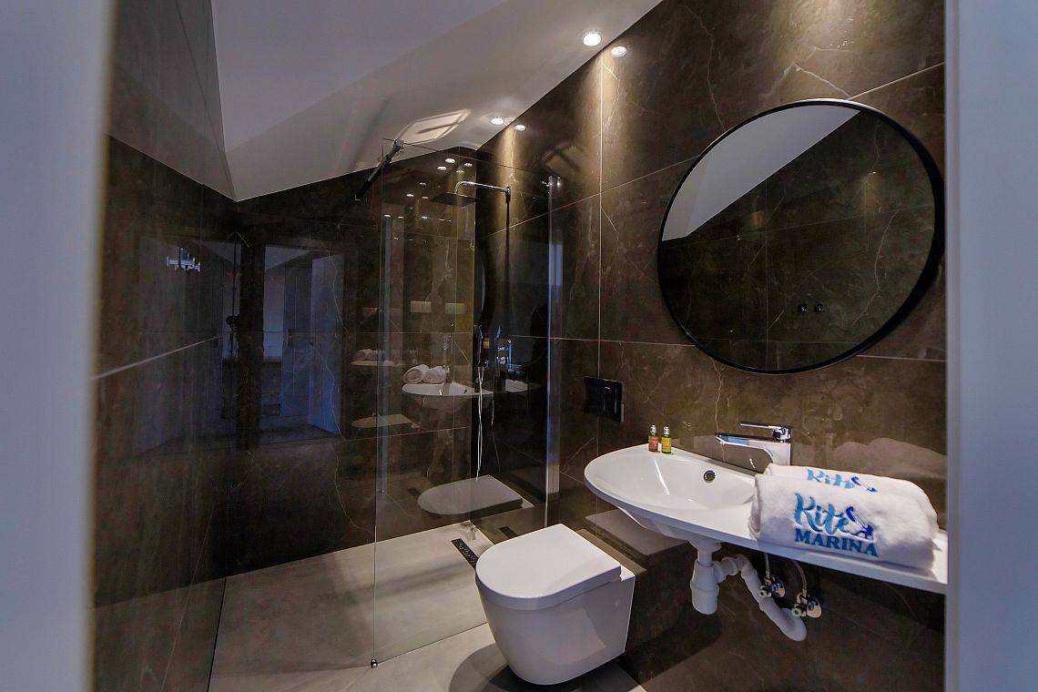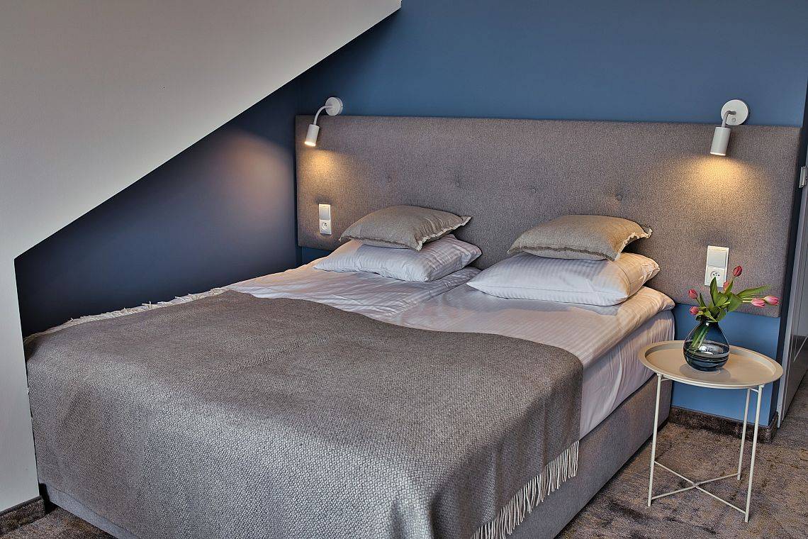 37 pokoi, w standardzie hotelowym, o stonowanym, nowoczesnym i funkcjonalnym wnętrzu. W każdym pokoju komfortowa łazienka, klimatyzacja, telewizor oraz wifi (dla tych wymagających). Dodatkowo 6 apartamentów, samodzielnych z osobnym wejściem, by maksymalnie odciąć się od ludzi, bez przechodzenia przez hol. Połowa pokoi znajduje się na stronie północnej, z pięknym, kojącym widokiem na jezioro. Druga część pokoi to strona południowa, widać stąd dużo zieleni, spokojną ulicę, po której nie porusza się nikt, oprócz Naszych Gości rzecz jasna. Bryła budynku przypominająca stodołę, przepięknie oszklona pozwala czerpać z letniego słońca jak najwięcej promieni. W tym samym budynku, za szklanymi drzwiami znajduje się restauracja o Nazwie Woda i Wiatr – nazwa wzięła się stąd, że przed budową nie było tu nic – tylko wschodni silny wiatr i woda jeziora.